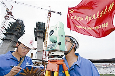 为了确保炎热天气里施工进度,日前,中铁四局二公司宁波铁路枢纽新建北环线项目经理部开展“甬江之畔党旗红、科技攻关争先锋”党建主题活动。图为该经理部二分部技术人员正在甬江左线特大桥进行索导管定位测量。 李旭 黄伟光 阚敏生 摄