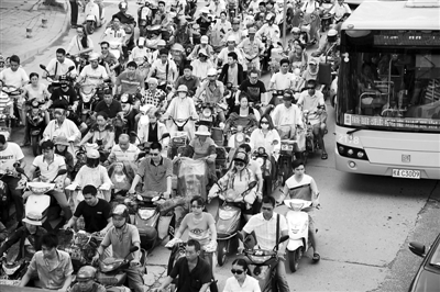 8月8日,广西南宁市街头行驶的电动自行车。据不完全统计,目前南宁市的电动车总数已达到80万辆,其中至少约70%属于超标电动车。从2013年8月15日开始,南宁市启动全市电动自行车集中登记上牌工作,2014年1月起全面实施规范化管理,遏制电动自行车交通违法蔓延态势。今后,无牌证车辆将禁入市区。 CFP供图