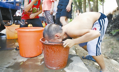 在湖南省祁阳县羊角塘镇兴隆村,600多名常住人口的生活用水问题只能依靠抗旱服务队送水车送来的水解决。一名男孩将头扎进刚刚接满水的桶里痛饮。