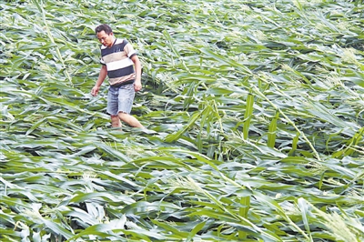 8月1日以来,我国多地出现强降雨、大风等强对流天气,造成农作物受灾倒伏。这是重庆市大足区金山镇团丰村三组的一名农民在查看倒伏的玉米。