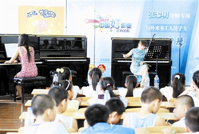 当日,“中国好作业——与外来务工人员子女一起弹钢琴”公益活动在上海中华职业技术学院奉贤校区举行。“中国好作业”出题人上海电影艺术学院的张黎明教授带领来自上海城区的“中国好作业”学员,与来自郊区金汇学校的农民工子女联合举行了一场别开生面的钢琴弹奏会。来自城市的学生与50多名农民工子女一起进行了一场艺术互动。新华社发(赖鑫琳 摄)
