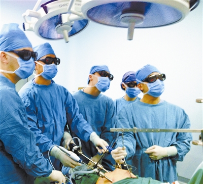 “在繁忙紧张的手术室里,医生们戴上了‘3D眼镜’,主刀医生双手熟练地操作细长的手术器械,抬眼观察着显示屏,显示屏上血管被一根根地显露,肌束被一层层、一丝丝分离、切断……”7月26日上午9时,这个犹如科幻电影的场景,如今正真实地发生在临床医学的应用中。