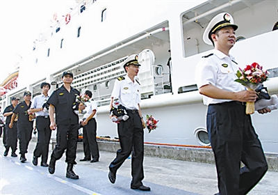8月11日,随“海巡01”轮出访归来的海事船员手捧鲜花参加欢迎仪式。