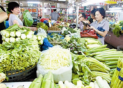 8月11日,一些顾客在上海市宁夏路附近的一家室内菜场选购蔬菜。