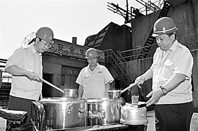 在邯矿集团金华焦化公司日前开展的“讲奉献、送清凉”活动中,公司党委积极为一线职工办实事、做好事、解难事,有效调动了职工的劳动积极性和主动性,为提前实现全年任务目标奠定了基础。图为该公司党委书记杨宝峰为一线职工送降暑饮品。