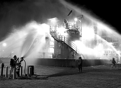 8月12日,消防官兵在演练中对发生火情的化工设备进行灭火。