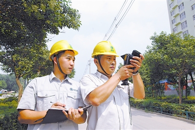 图为8月6日 ,聊城供电公司工作人员正在10千伏建设东线进行红外测温。