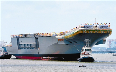 当地时间8月12日,印度首艘国产航母“维克兰特”号在印度科钦船厂正式下水。此艘排水量为4万吨级的航母下水时间已落后原计划4年。印度海军消息人士透露,“维克兰特”号的实际部署时间大约接近2020年,因为这艘航母的建造工作目前只完成30%左右。谢涛 供图