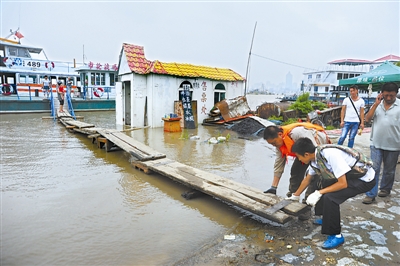 8月13日,位于松花江北岸的船厂码头已经被上涨的江水淹没,船员在调整被江水冲斜的跳板。