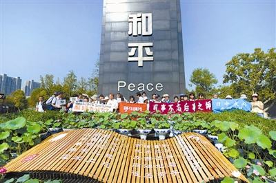 8月15日是日本宣布战败投降、中国人民抗日战争暨世界反法西斯战争胜利68周年纪念日,来自海内外各界爱好和平的人士在侵华日军南京大屠杀遇难同胞纪念馆举行国际和平集会,通过敬献花圈、默哀、日本友人访谈等多种形式悼念南京大屠杀30万遇难者,祈祷世界和平。和平集会上,中日双方与会人员共同发出了和平誓言:吸取历史教训,反对战争与暴力,防止历史悲剧重演,为维护亚洲与世界和平而努力奋斗。乐涛 摄