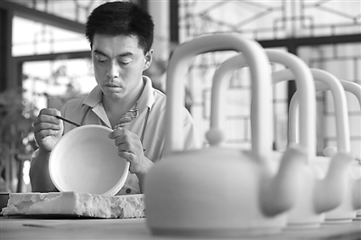 8月14日,在辽宁省西部的朝阳市喀左县一家陶艺企业,一名艺人在制作辽青瓷产品。
