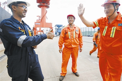 8月2日,一艘外国货船上的大副在离开港口前竖起大拇指称赞中国工人的服务。