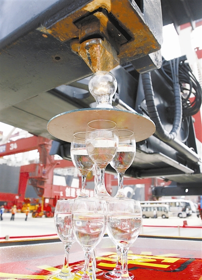 8月1日,青岛港技术工人用起重机表演“永担千斤”的绝活——用10吨重的吊具轻压灯泡使其接触电源而点亮。