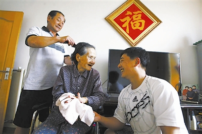 杜毅(图右)和父亲为奶奶梳洗,一家三代准备照张合影。