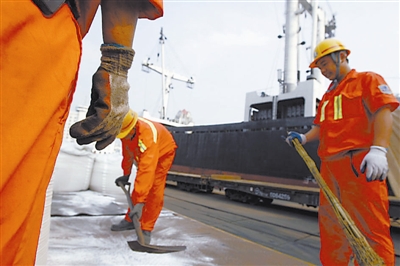三伏天里的码头湿热难耐,装卸工人正在辛勤劳作。
