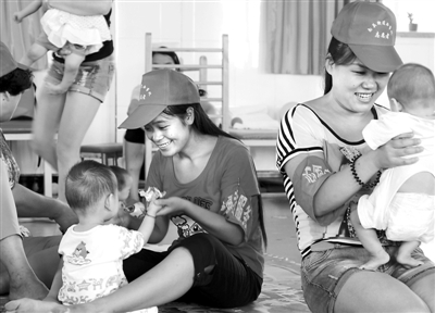 8月16日,河南省许昌市福利院,志愿者在与福利院的孩子进行亲情交流、玩耍。当日,许昌市魏都区南关街道办事处大同社区组织志愿者来到许昌市福利院,为这里的孩子送来了尿不湿等物品,并与他们进行爱心交流。 牛志勇 摄/东方IC