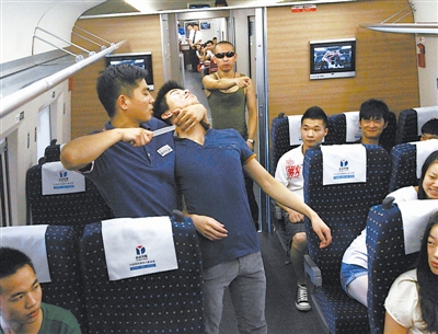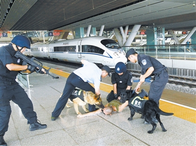 8月1日下午,武汉铁路警方在武汉火车站开展保暑运安全反劫持演练。当日,武汉铁路公安处信息指挥中心接到报警称,由广州南开往武汉的动车组列车某节车厢被2名匪徒控制,该车厢内20余名旅客生命财产安全受到了危害。接报后,武汉铁路公安局武汉公安处将警情向上级进行了汇报,处长黄国祺、政委卢健高度重视,要求立即启动反劫持应急处置预案。2时30分,武铁警方反劫持小组部署就绪,对即将乘坐火车进站的匪徒张网以待。