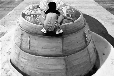 一个孩子趴在“笼屉”上拍照留影。