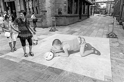 8月14日,北京,15幅老字号3D立体画亮相前门大街,吸引了游客纷纷驻足观看。当天,第四届前门历史文化节举行,在840米的前门大街上,“铛铛车来了”、“好大一双鞋”、“客官歇会儿喝杯茶”等活泼有趣的立体画将前门独有的文化符号、老字号文化利用现代技术呈现出来,吸引了不少外地及外国游客的关注并拍照留念。