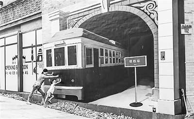 两位游客在3D立体画“铛铛车来了”前做推动状。
