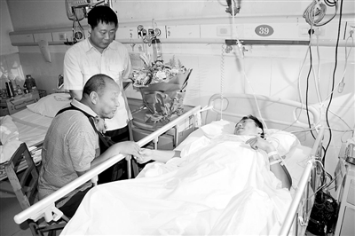 得知刘绍彦住院,乘车时总被他照顾的盲人李达义特意赶到医院探望(8月15日摄)。