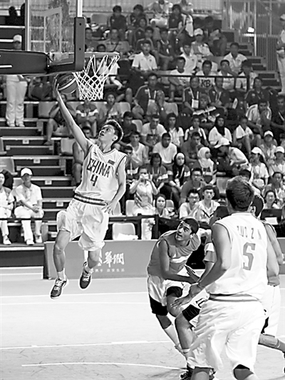 在南京亚青会男子三对三篮球比赛D组第二轮的较量中,中国男篮以21比6战胜约旦男篮。本报记者 郎成 摄