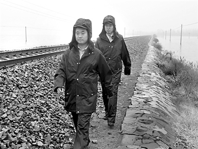 近日原平地区连下暴雨,太原铁路公安处原平车站派出所加强雨中巡线。图为原平车站派出所民警正在冒雨进行巡线。