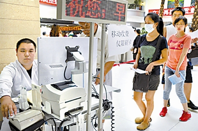 8月19日,北京人民医院开始试用移动收费机。这种收费机的使用在该市尚属首次,可在一定程度上解决高峰收费排队的问题。