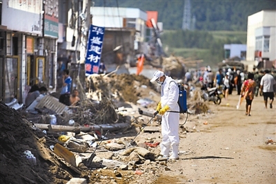 当日,辽宁抚顺洪水灾区病毒消杀工作有序进行,专业医护人员在受灾地区喷洒消毒液、检查村民健康情况,严防病疫传播。 新华社记者 潘昱龙 摄