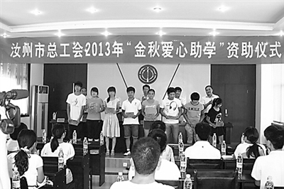 8月15日,河南省汝州市总工会举行2013年“金秋爱心助学”资助金发放仪式,现场为48名困难职工家庭学生发放了10.4万元资助金,帮助考上大学的困难职工家庭学生解决实际问题。图为市领导为受助学生发放资助金。李军现 刘建国 摄
