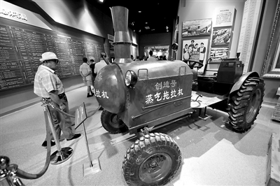 8月20日,观众在中国工业博物馆沈阳铁西馆参观铁西制造的蒸汽拖拉机模型。