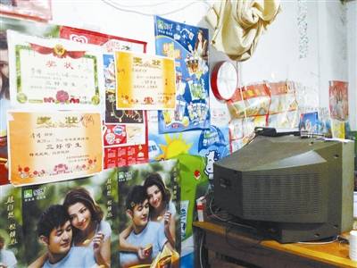 在女儿获得的两张奖状旁,贴着一张韩美丽为儿子自制的“三好学生”奖状(右),母亲对儿子的殷切希望显露无遗。