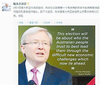 ——随着澳大利亚联邦选举的临近,现任工党总理陆克文正在抓紧时间为自己拉票。8月21日,他在新浪微博上用中文呼吁,希望澳大利亚的选民会投票支持工党,微博结尾署名“老陆”。在该贴附上的长博文中,他详细阐述了自己的竞选主张,誓言要力促经济的强劲发展,解决工薪家庭关注的就业保障问题。