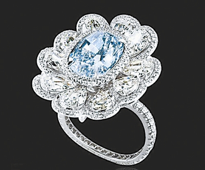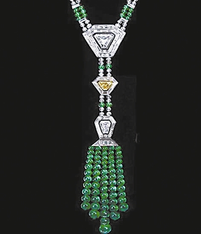 近日在戛纳珠宝展上被抢走的珠宝照片曝光,奢华璀璨令人惊叹。其中包括一个镶有巨大的23.14克拉的心形钻石吊坠(上图),两个镶钻戒指(图1),一条重约127.26克拉的绿宝石和钻石项链(图2)。资料图