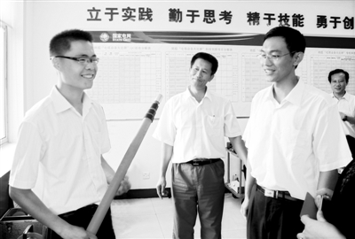 在听李师傅说话的同时,记者看到刚才说开场语的小伙子,他站在李师傅身旁,脸上一直挂着带有光泽的自信表情。经介绍记者得知,这小伙子叫贾寅飞,大学毕业后来到班组4年就成了铁老师的得意门生,去年还当上了该班班长。他曾参与《班组“大讲堂”培训模式》、《生产过程标准化典型经验》、《便携式互感器极性试验组合工器具》等10多个创新攻关项目的研制工作,如今也成了创新能手。