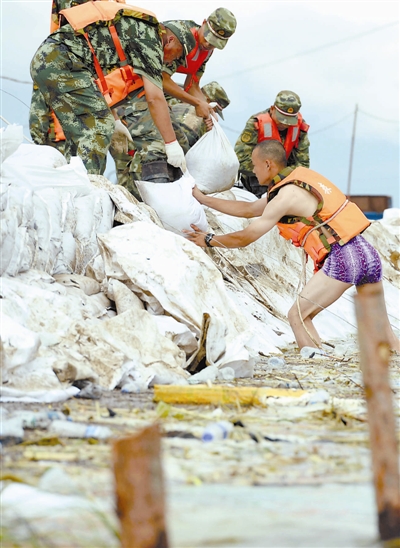 8月23日,武警战士们涉水加固堤坝。