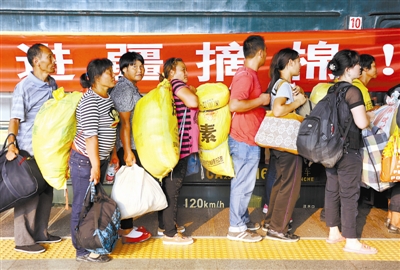 8月25日,进疆摘棉的农民工在郑州火车站准备上车。