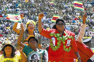 8月25日,津巴布韦民众在首都哈拉雷郊外烈士公墓聆听穆加贝讲话。