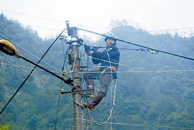 近日持续降雨,使浙江省境内不少电力设施被冲垮。为了尽快恢复供电,国网瑞安供电公司高楼供电所职工在对高楼镇洋岙村受损低压线路进行抢修。薛若丹 摄