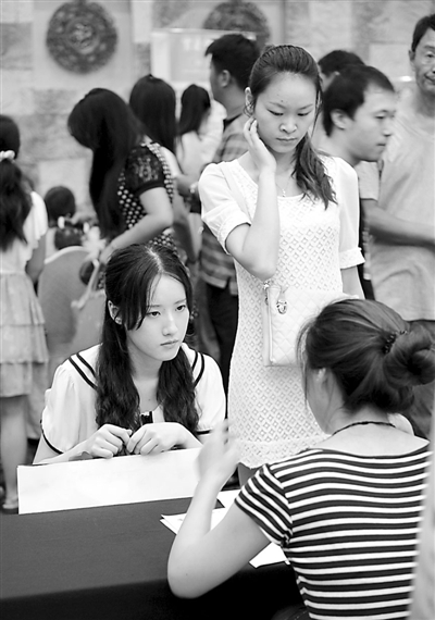 8月28日,求职者在用人单位招聘摊位前应聘。