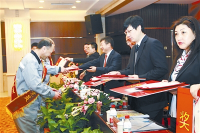 集团及矿业公司领导为受表彰的矿业公司先进职工颁奖