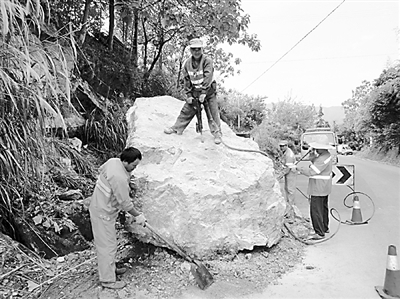 据参加排险的璜山公路站养护员陈财勇介绍,他们先用风镐在巨石上打出间隔孔眼,并排锲入钢凿,把巨石挤裂,逐一分解成能抬起的石块,再将其清运掉。从8月26日一早开始工作到8月27日晚6点,养护工们才将这块顽石清除。(陈彦 袁季军 文/摄)