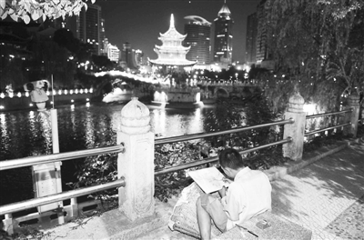 8月26日20时,贵阳南明河甲秀楼附近,一背篼农民工在路灯下绘制南明河上的古建筑甲秀楼。月下,他以大地为凳子,以背篼为桌子,一笔一画感动不少游客和市民。