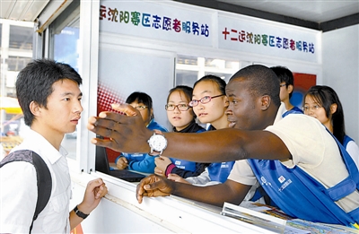 在沈阳北站的“十二运沈阳赛区志愿者服务站”,有一位来自非洲加纳的留学生志愿者Eric,他的中文名叫王明。王明2009年来到中国,在沈阳医学院学习临床医学专业,目前已经毕业。从今年6月中旬开始,王明就来到沈阳北站的志愿者服务站担当志愿者,每天为沈阳北站的旅客和行人提供水、指路、手机充电等服务,成为沈阳北站和第十二届全运会的一道特殊“风景”。