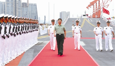 当天下午,习近平又风雨兼程赶往大连,登上停泊在大连港的辽宁舰。军旗迎风飘扬,水兵整齐列队,辽宁舰迎来了一个庄严光荣的时刻。习近平检阅了水兵仪仗队,随后攀舷梯、下机库,深入舱室战位,察看舰上装备设施,询问技战术性能,了解官兵工作训练情况。习近平十分关心舰上官兵后勤保障情况,住宿、饮食、看病等,他问得很详细。习近平接受了水兵们精心准备的舰徽、舰帽,郑重在航泊日志上签名。