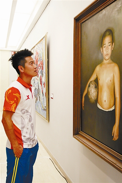 作为第十二届全运会的形象大使,辽宁足球的旗帜性人物肇俊哲也来到本届中国体育美术精品展的现场。一幅夹着足球的小球员的油画让肇俊哲驻足了很久。本报记者 郎成 摄