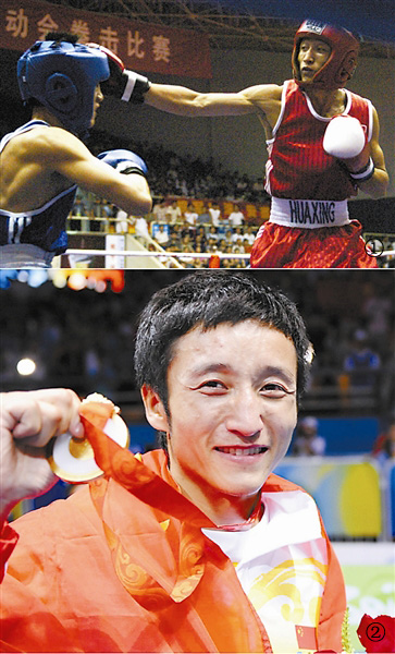 ①为2005年9月12日,贵州选手邹市明(右)在第十届全运会拳击48公斤级决赛中,战胜解放军选手高亮,获得冠军。