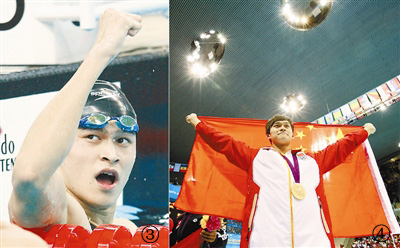 ③为2009年10月24日,浙江队选手孙杨庆祝胜利。孙杨在第十一届全国运动会男子1500米自由泳决赛中,以14分54秒87的成绩获得冠军。