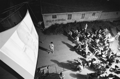 8月20日,山东省平度市古岘镇,电影放映员崔桂贞正在给当地村民们放映电影。