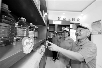9月1日,山东省薛城区“爱心储户”孟庆荣(右)在“爱心银行”里准备兑换物品。
